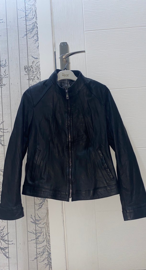 HECE marka siyah deri biker ceket, yüksek yaka ve fermuarlı ön tasarıma sahiptir. Normal kesim, uzun kollu ve midi boydadır, sokak modasına uygundur.