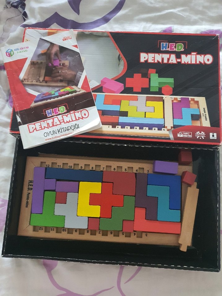 HED Penta-Mino eğitici oyuncak, çok renkli geometrik parçalar ve ahşap taban içerir. Oyunu yönlendiren kullanım kitabı dahildir.