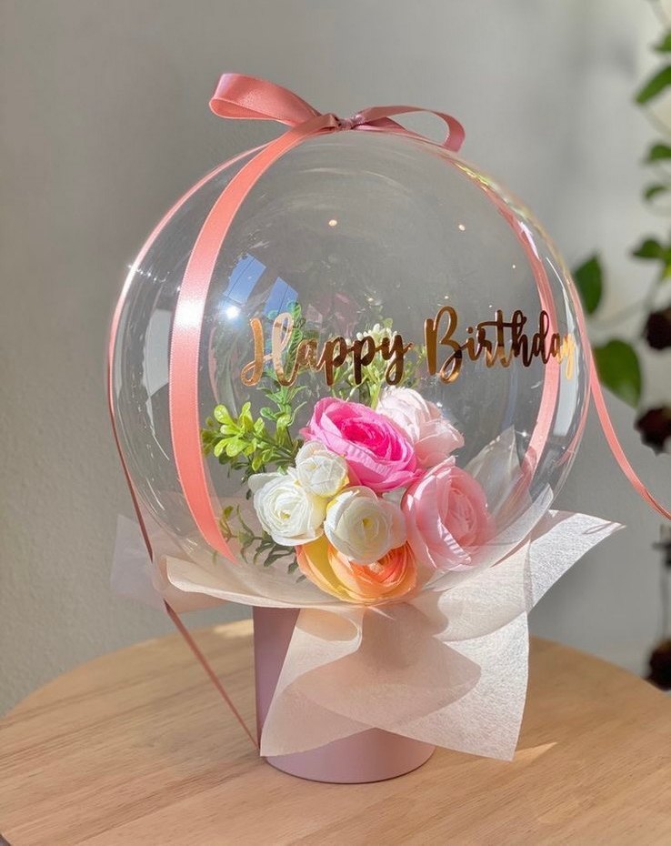 Şeffaf balon, pembe pastel kurdeleler ve yapay çiçeklerle süslenmiş, altın renkli 'Happy Birthday' yazılı narin bir parti süsü .