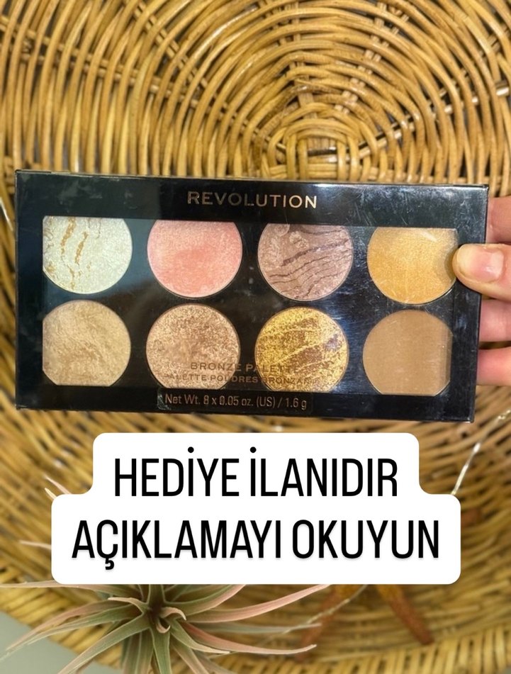 Revolution bronze palette Sayfamdan 1000 tl alışveriş tutarını geçene hediye edeceğim. Her siparişte küçük veya büyük hediye gönderiyordum şimdi bu şekilde bir yol izlemek istedim. İndirim ve kuponlarla alışveriş 1000 tl üstü olan ilk kişiye bu highlighter ve bronze içeren paleti göndereceğim. Ürünü çok az kullandım. Görsellerden görebilirsiniz sadece çekmecemde dış kapında çizikler oluştu o da her paletin hazin sonudur zaten. Teklifim ay sonuna kadar geçerli. Bu şekilde belirli hediyelerle alışveriş kotası koyma fikrini severseniz farklı bekleyen ürünlerim de var , açık bej ve bronz tonlarında sekiz renkten oluşur, yumuşak ve doğal makyajlar için uygundur. ️