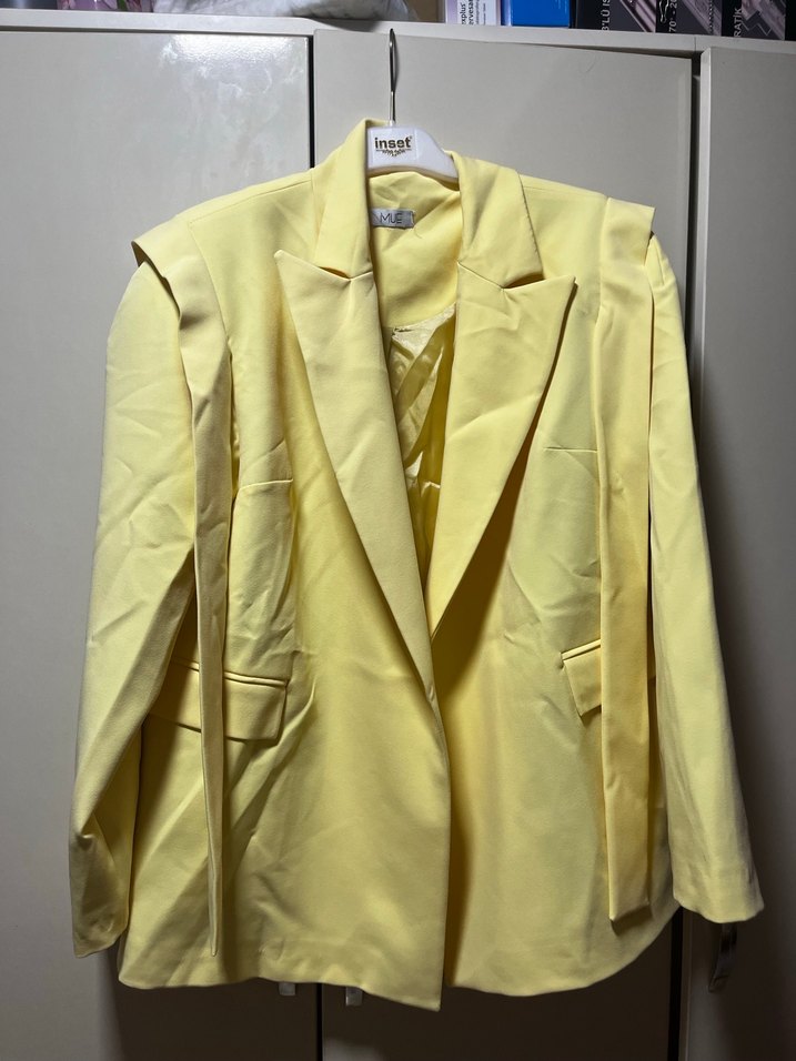 Sarı uzun blazer, düğmeli ve kesik yakalı, sentetik kumaştan yapılmıştır. Ofis ve sokak stiline uygun, regular fit ve uzun kolludur.