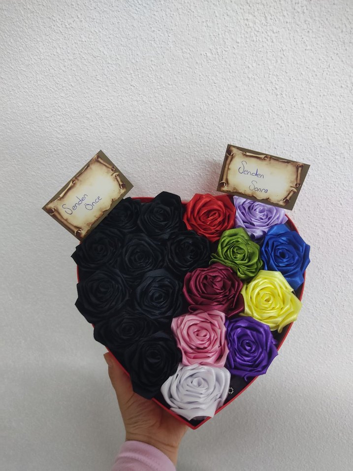 kalpli kutu içinde led lambası olan solmayan güllerle kaplı senden önce senden sonra yazısıyla sevgiliye eşe ömür boyu hatıra kalacak hediye