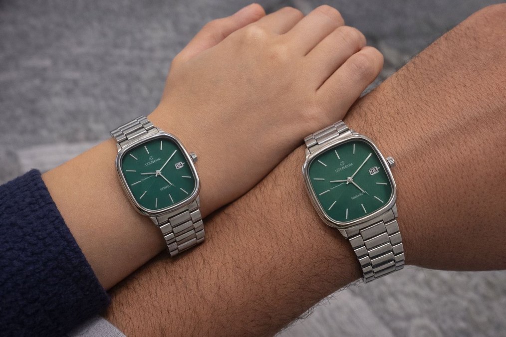 Parlak yeşil kadran ve gümüş metal kayışa sahip, çağdaş klasik tasarımlı erkek saati, tarih göstergeli. ⌚