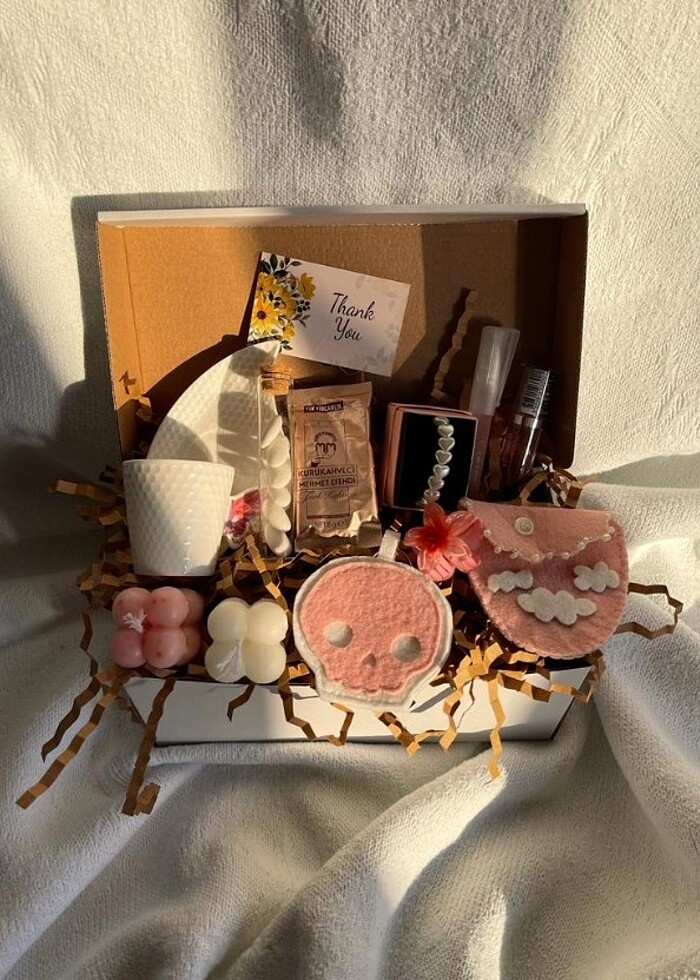 KUTU İÇERİĞİ: •Kahve Fincanı •Kahve ve şeker •Cüzdan •Anahtarlık •Pembe ve beyaz bubble mum •Kalp inci kolye •Lip Gloss •Kalem Parfüm •Lotus Toka Kutu süslemesi ve kırpıntı kağıtlar da dahildir