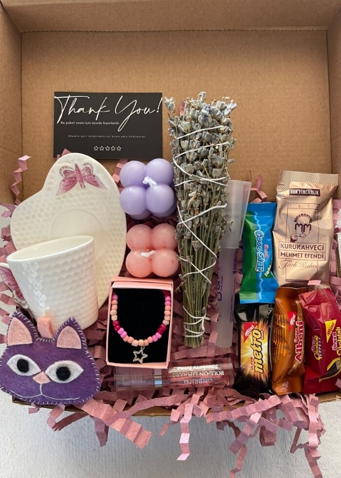 KUTU İÇERİĞİ: •Kahve Fincanı •Kedi anahtarlık •Pembe ve mor bubble mum •Pembe boncuk kolye •Kahve ve şeker •Kalem parfüm •Lavanta Tütsü •Lip Gloss Kutu süslemesi ve kırpıntı kağıtlar da dahildir