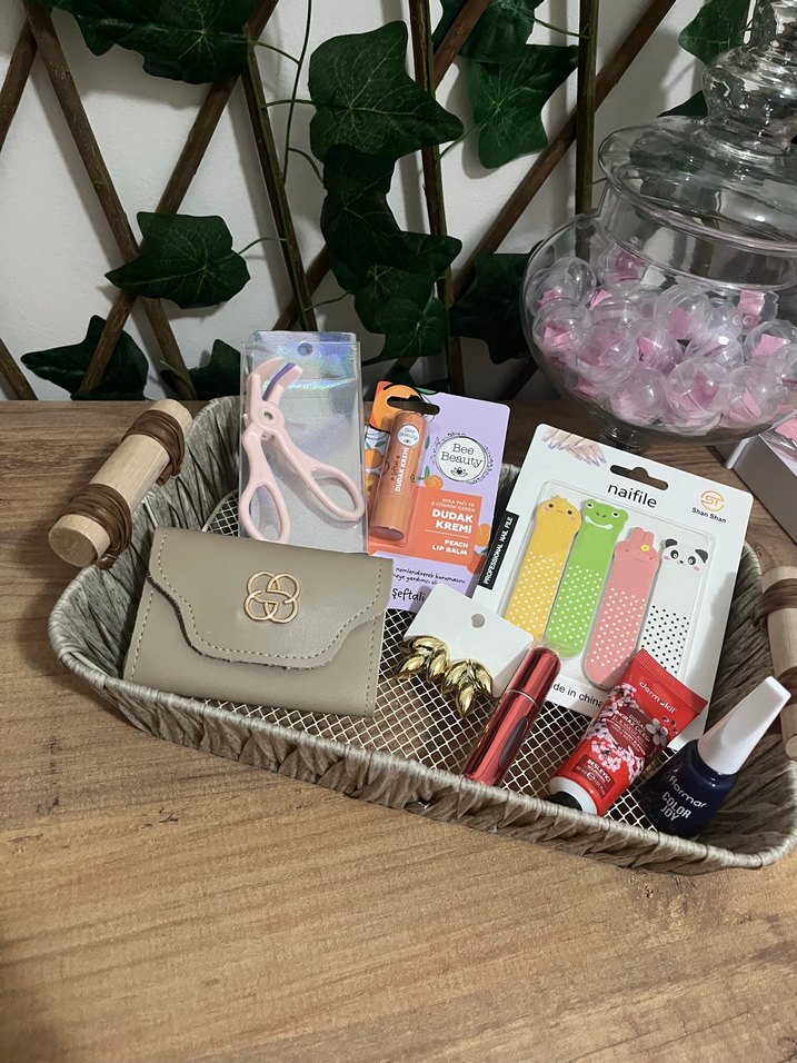 Kartlık - kirpik kıvırıcı - dudak nemlendirici - mini törpü seti - küpe - mini boy parfüm şişesi - el kremi - oje