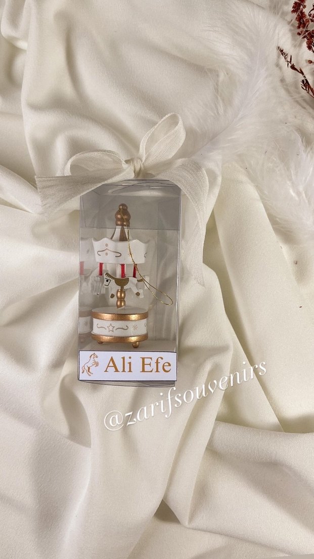 Beyaz at figürlü müzik kutusu, kişiye özel isim etiketiyle paketlenmiş, hediye için uygun bir üründür.