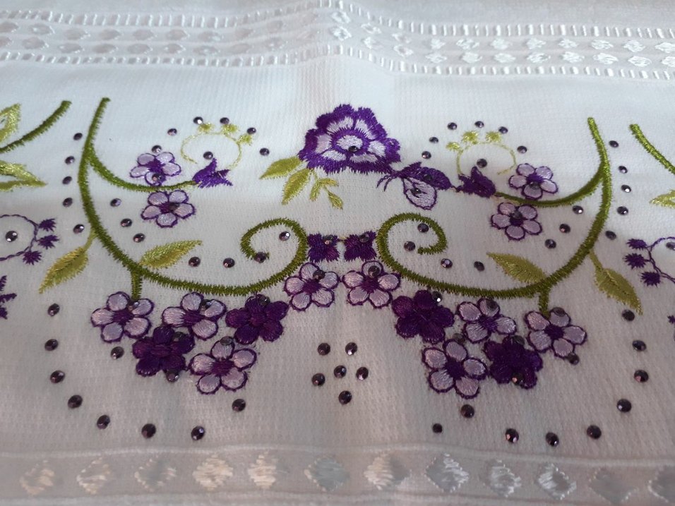 Bu havlu, beyaz kumaş üzerinde mor ve yeşil renkli çiçek nakışlarıyla canlı ve geleneksel bir görünüm sunar. 1 adet 150 2 adet 250tl