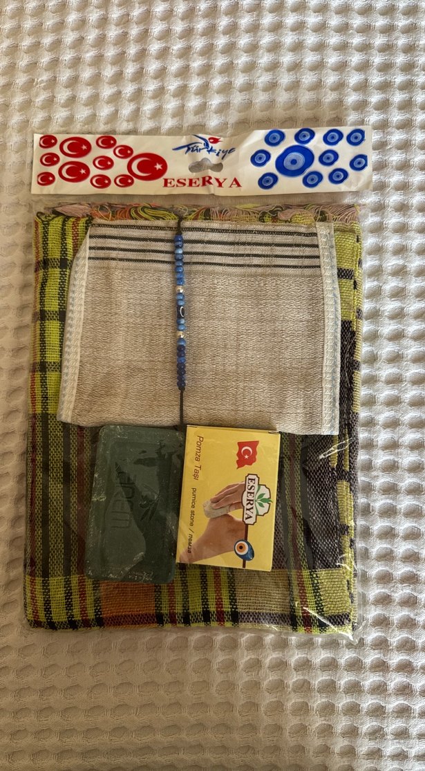 Hiç kullanılmamış.Peştemal, kese, pomza taşı, sabun, boncuk bileklik