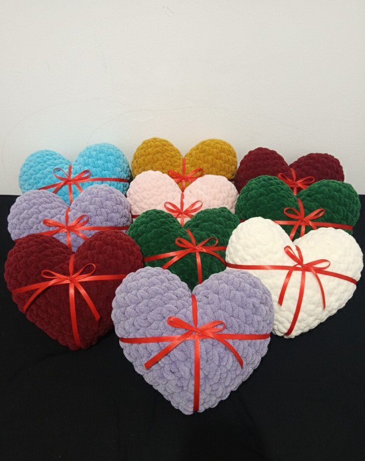 Farklı renklerde, kırmızı kurdele ile bağlanmış yumuşak kalp şeklinde el yapımı bohem hediyelikler . renk seçenekleri mevcuttur kişiye özel örülür sipariş alınır