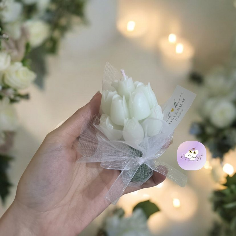 Beyaz lale demeti şeklinde, pastel tonlarda ve ince tül kurdele ile sarılmış dekoratif mum. ️istenilen adette hazırlanır etiket basılır