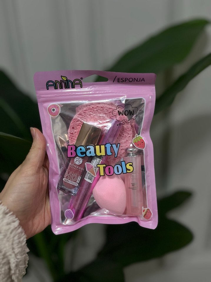 Görselin aynısını gönderiyorum. 5 adet ürün vardır. Allık, glos, maskara, yüz temizleme süngeri, makyaj süngeri.