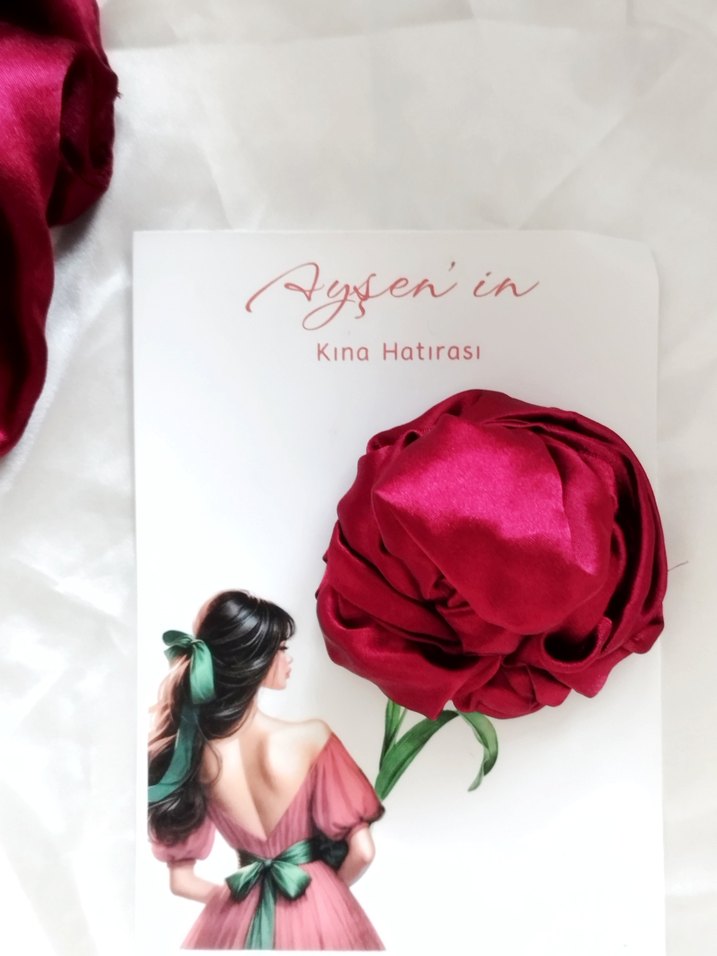 Bordo fiyonk detaylı, Paris esintili baskılı kadın broş. Koyu ve canlı renkleriyle romantik akşamlar için ideal. "Kina Hatirasi, ysenin" yazılı.