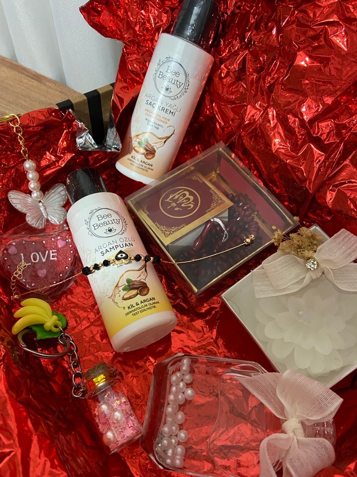 Argan yağı içeren vücut losyonu ve saç kremi seti, cildi ve saçı besleyip nemlendirir. Set içinde "LOVE" yazılı dekoratif ürün de bulunmaktadır.