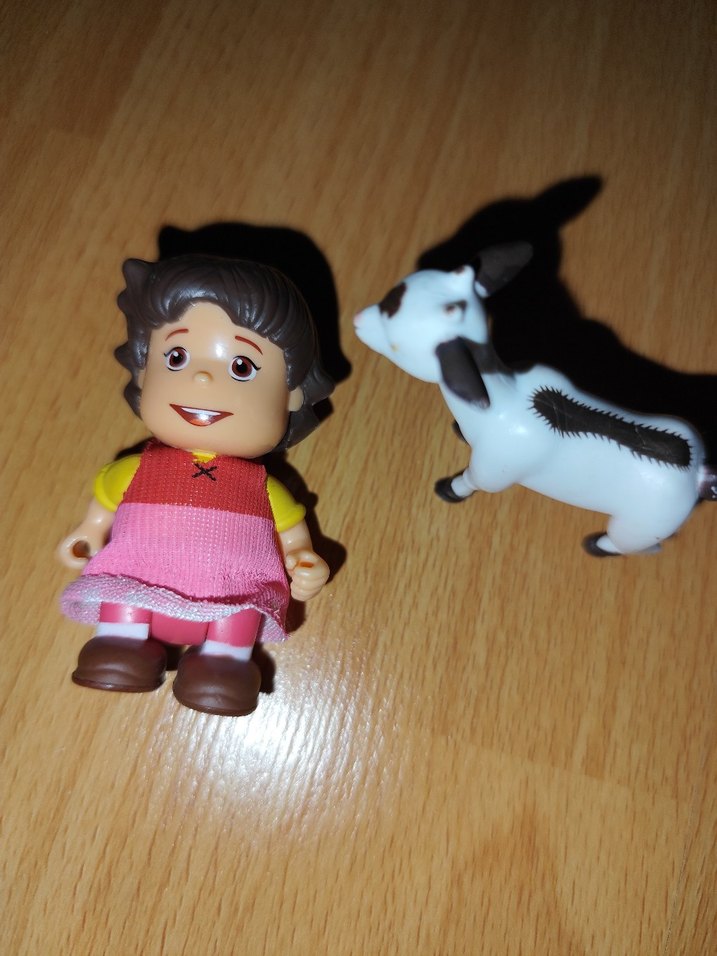 Renkli kahverengi bebek, pembe ve sarı kıyafetli, küçük beyaz ve kahverengi oyuncak keçi ile birlikte ahşap zeminde yer alıyor.