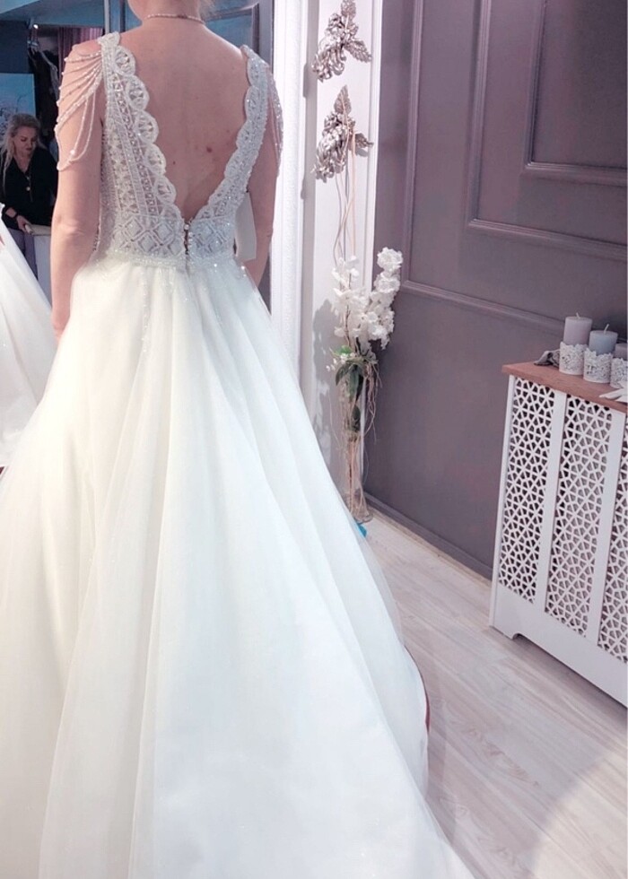 Gelinlik 1 defa giyilmiş olup, kuru temizlemesi yapılmıstır.Pırıltılı etek kısmı inci detaylı ve dantel el işlemeli üst kısmı özel tasarımdır.Sırttaki inci deray düğmelerden beli ayarlanabilmektedir.Gelinliği alana yere kadar uzanan kuyruk duvak da hediye edilecektir.Tarlatanı da gönderilecektir.