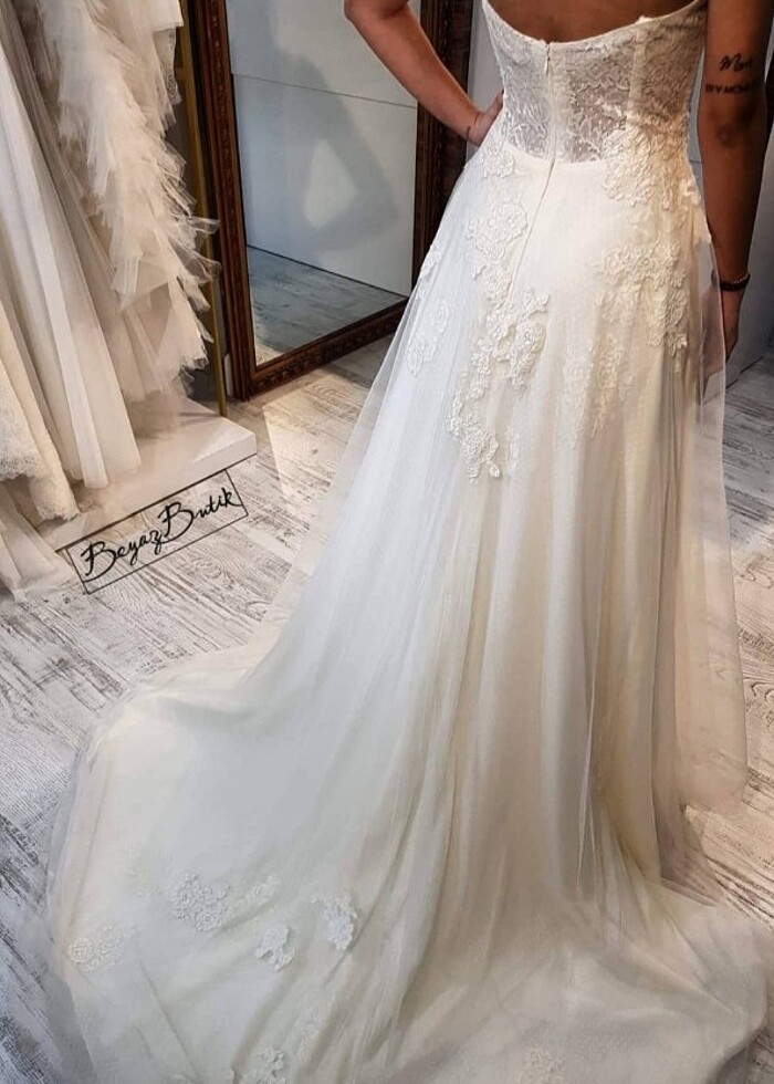Kapanan mağaza ürünüdür. İthal model olup kırık beyaz renkli ve eteğinin her katında farklı bi dantel ve tül kullanılmıştır