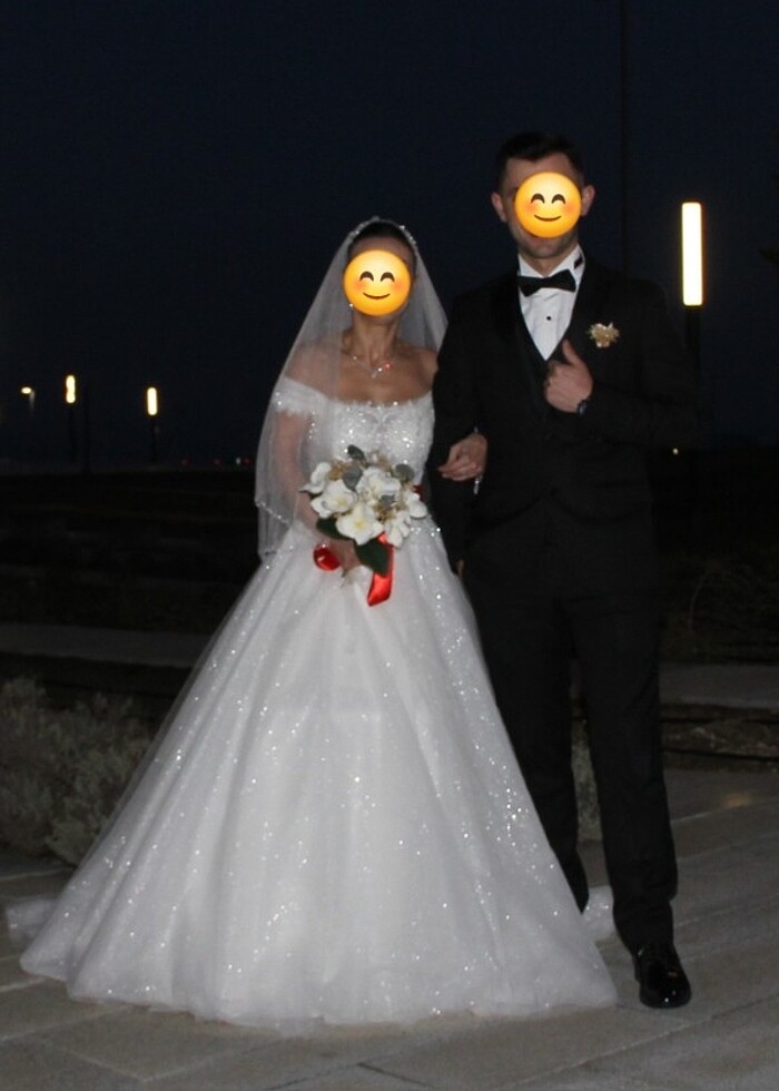 32-34 bedendir. Resimdeki mankenin boyu 150 cmdir. Topuklu ayakkabı boyu 10cmdir. Gelinlik 160 cm boya göre dikilmiştir. Beli 60-62cmdir. Omuz çevresi 62 cmdir. Bir kez giyilmiştir. Özel dikimdir. Gelinliğin üstünde simler var. Tarlatanı, Taç ve duvağı ile verilecektir. #gelinlik