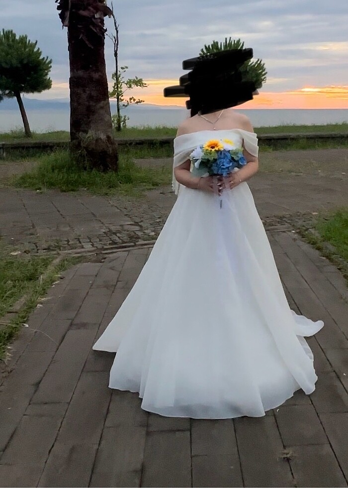 Sade ve şık bir model. Tarlatanı çok kabarık değil helen model kayık yaka. Göğüs ve bel kısmında incili işlemesi mevcut. Herhangi bir arızası yok etek kısmında lekeler mevcut kuru temizleme ile yeni gibi olacaktır. 38 beden fakat arkası ipli 36 ve 40 a da uyum sağlayabilir. Bel ölçüsü 69cm göğüsten boy 146 cm belden ise 117 cm. Boyum 163, 10 cm topukluyla resimdeki gibi duruyor. İncili taç ve incili duvağı da hediye veriyorum yanında.