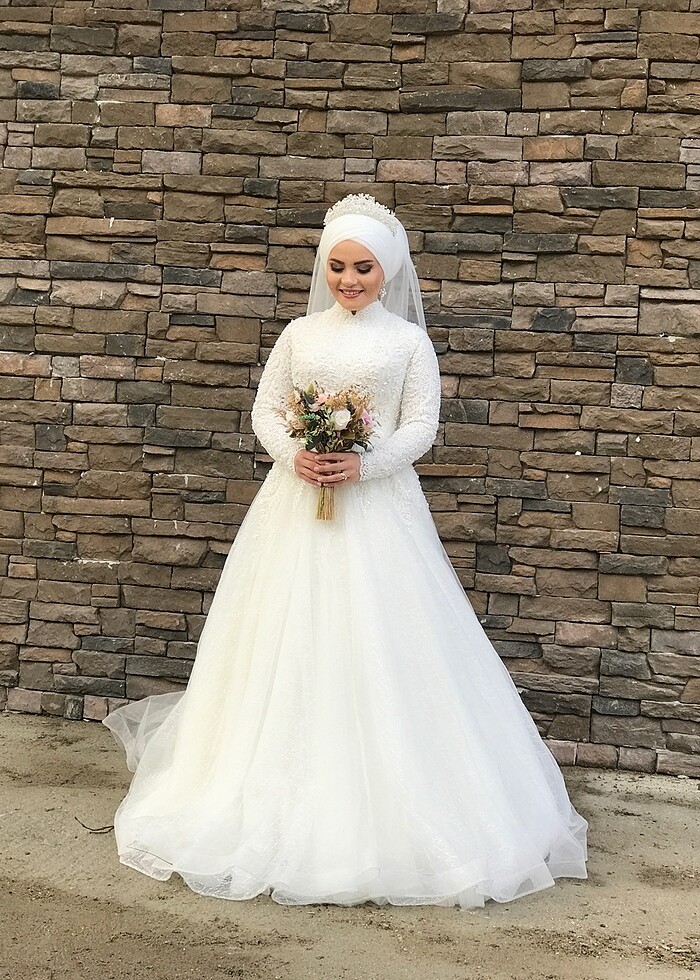 Gelinliğim zamansız ve çok rahat bir gelinlik helen kesim simli eteklidir üstü komple inci işlemelidir özel dikimdir alıcısı olursa çiçek ve tacı yanında göndereceğim