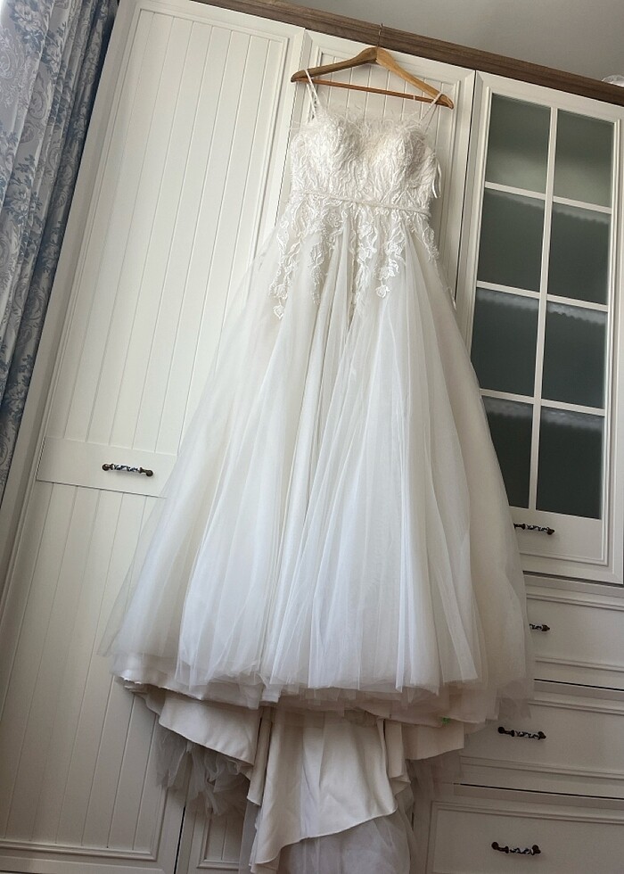 Bir kere giyildi kuru temizleme yapıldı. Bir sorunu yoktur. Helen kuyruklu modeldir. Arkası ipli olduğundan ve fermuarı genişletilebilir olduğundan her iki bedene de rahatlıkla olacaktır. Rengi ekru rengidir. Işık nedeniyle krem gibi görünmektedir. Ütü istemektedir kapalı kutuda beklediği için.