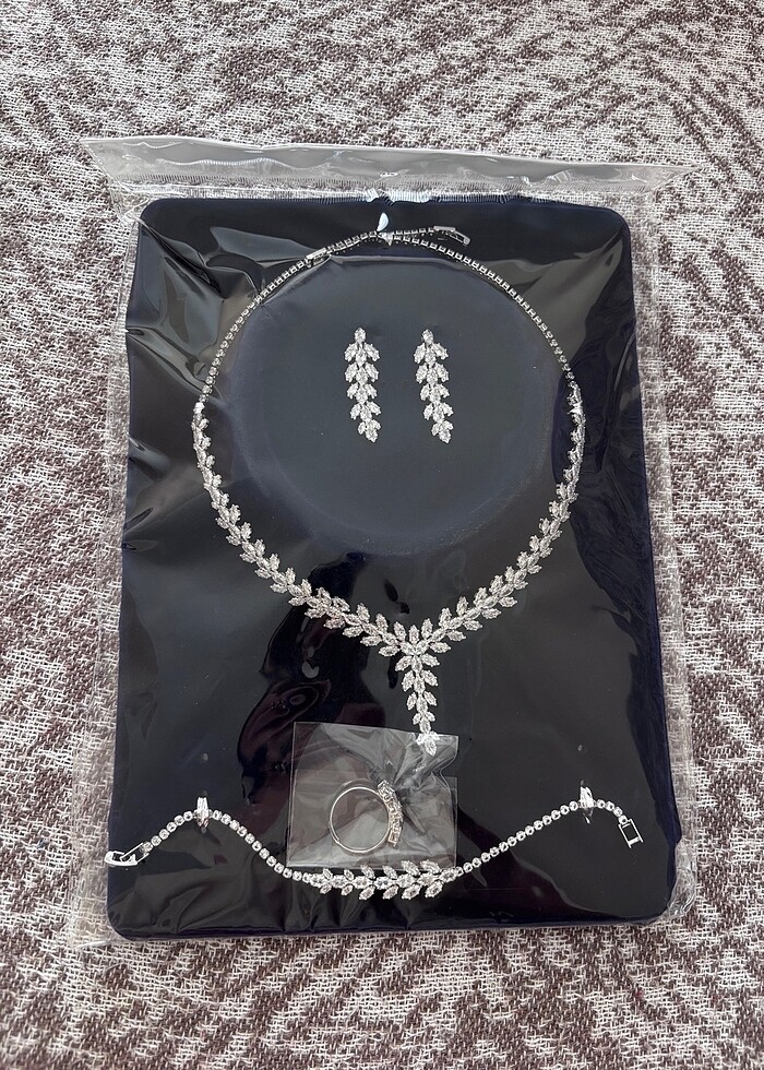Ürün hiç kullanılmadı. Kolye, yüzük, küpe ve bileklikten oluşuyor. Gelinlik üzerine ya da özel davetlerde kullanmalık çok güzel bir set.