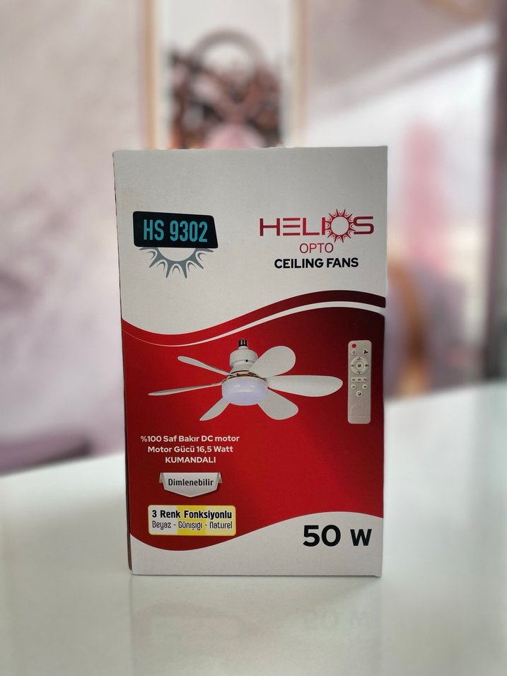 Helios tavan vantilatörü 50W güçte, 3100 RPM saf bakır DC motorludur. Kumandalı ve bej, gri, naturel olmak üzere 3 renk fonksiyonuna sahiptir. Dimlenebilir özelliktedir. ️