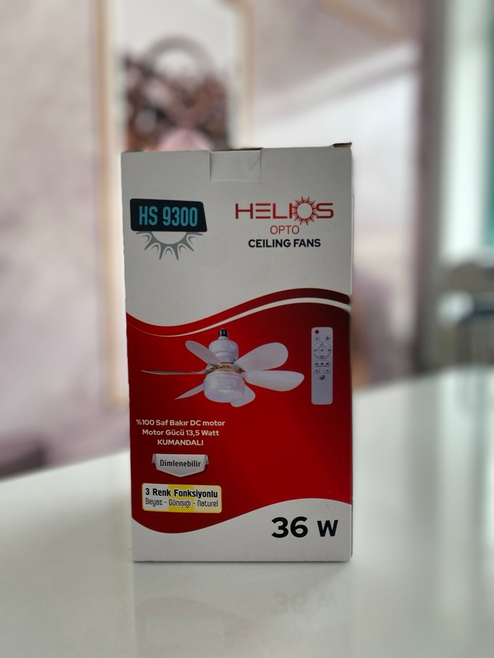 Helios HS9300 tavan vantilatörü, 36W motor, kumandalı ve 3 renk fonksiyonlu ayarlanabilir ışık sunar. Güvenli DC motor içerir. ️