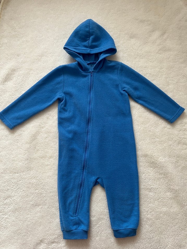 Kapüşonlu ve fermuarlı mavi bebek tulumu, yumuşak ve sıcak kumaştan. Günlük kullanıma uygun sade, renkli tasarım. ❄️