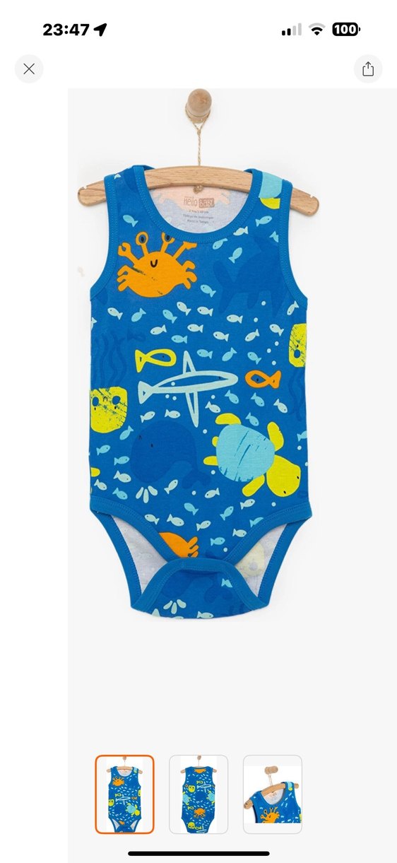 Kolsuz, mavi renkli deniz canlıları desenli, boğazlı, yumuşak örme kumaştan erkek bebek body.
