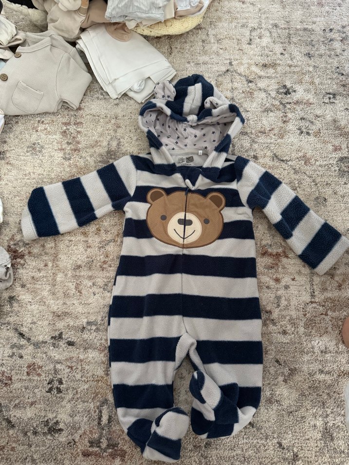 Peluş kumaştan yapılmış, kapüşonlu ve ayaklı erkek bebek tulumu. Önünde sevimli ayıcık yüzü ve gri-lacivert çizgili desen bulunur.