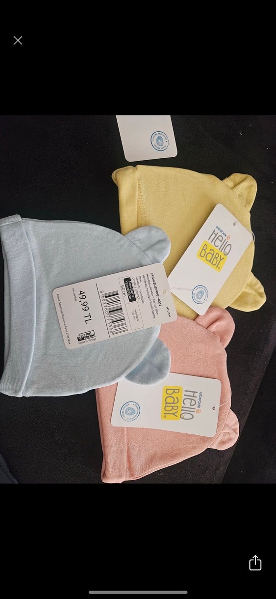Sarı, mavi ve pembe pastel renklerde, yumuşak kumaşlı ve "BaBY." baskılı üçlü bebek şapkası seti.