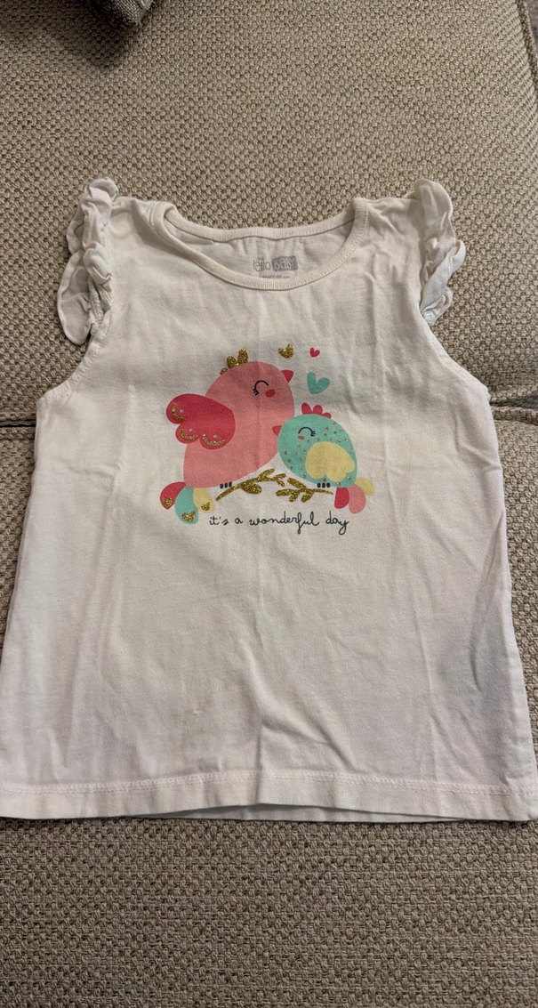 Pamuklu, beyaz renkte, fırfırlı kollu, baskılı ve yuvarlak yakalı kız çocuk tshirt. Rahat kesimlidir. 3 yaş