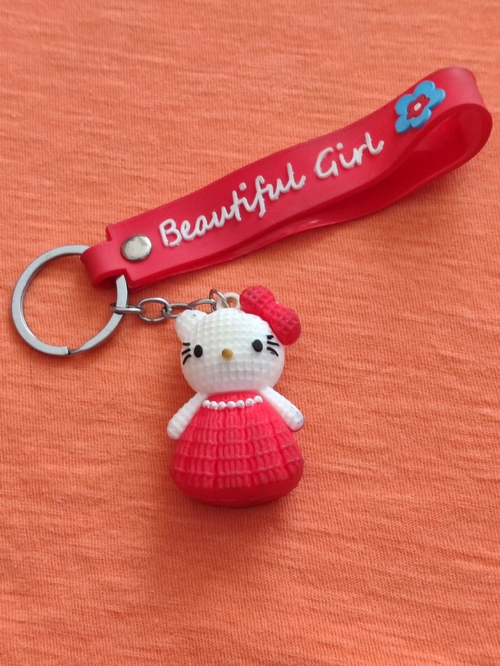 Kırmızı hello kitty figürlü anahtarlık. 'Beautiful Girl' yazılı kayışıyla sıcak ve sokak tarzına uygun, iddialı bir aksesuar.