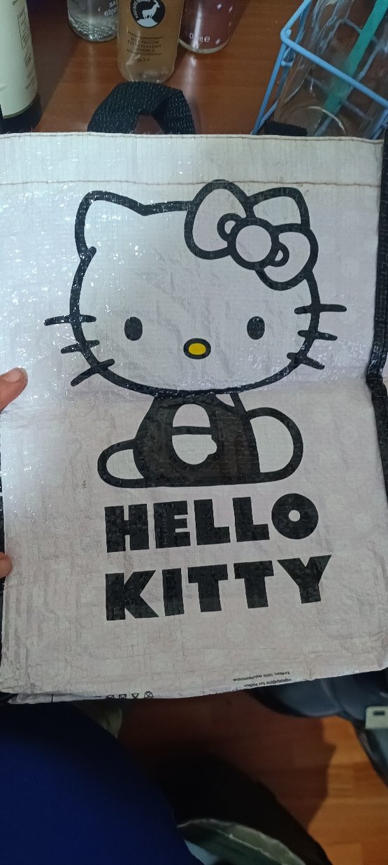 Gri plastik malzemeden yapılmış, baskılı Hello Kitty desenli çocuk taşıma çantasi