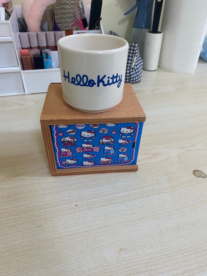 Seramikten yapılmış, üzerinde mavi Hello Kitty yazısı bulunan kupa ve çeşitli Hello Kitty çizimleriyle süslenmiş ahşap kutu. ☕