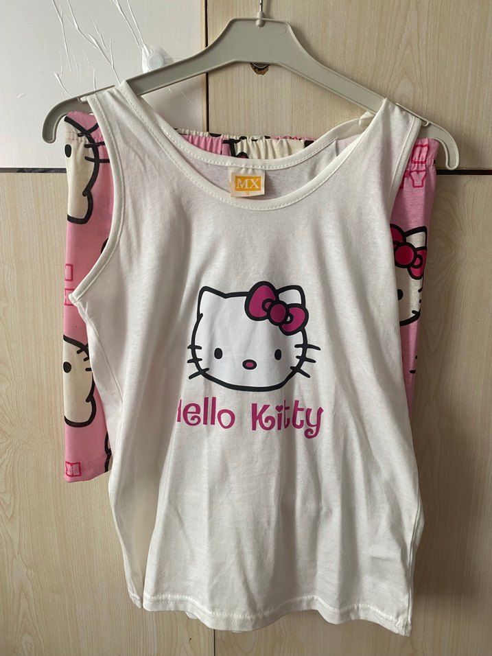 Pastel pembe renkli, baskılı Hello Kitty desenli ve dantel detaylı kedi kıyafeti. Rahat ve şık bir sokak giyimi parçası.