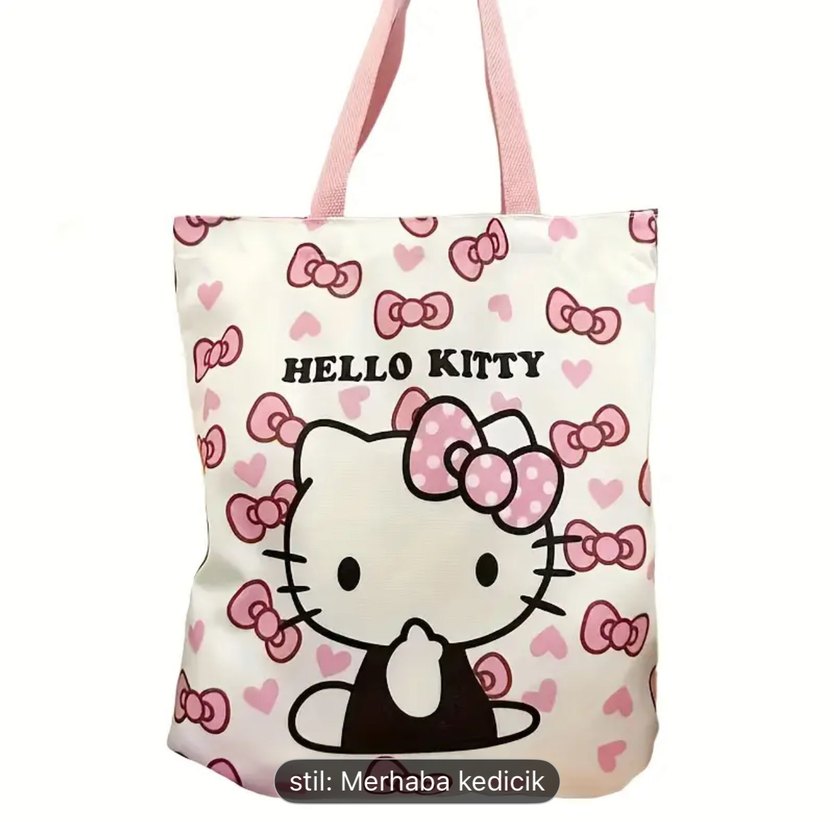 Pembe renkte, baskılı Hello Kitty desenli ve fiyonk detaylı kadın tote çanta. Sentetik kumaştan, günlük kullanıma uygun, trend sokak stili için ideal.