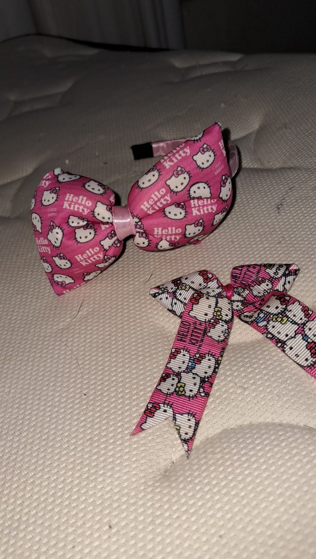 Renkli Hello Kitty desenli pembe fiyonk ve uyumlu saç tokaları içeren çocuk saç aksesuarları.