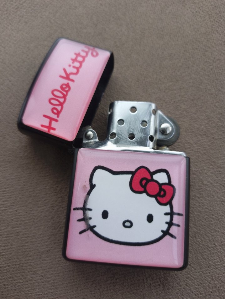 Renkli pembe kedi aksesuarı, Hello Kitty tasarımıyla dikkat çekiyor. zippo cakmak