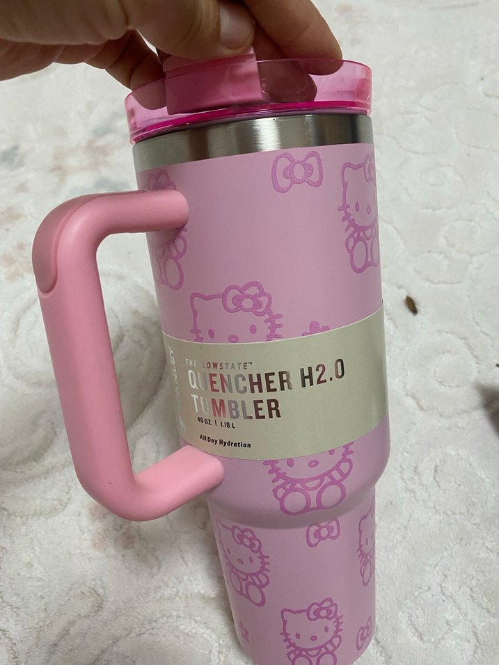 Pastel pembe Hello Kitty desenli termos bardak, sağlam kulplu ve paslanmaz çelik iç yüzeyli. Quencher H2.0 modeli, kolay taşınabilir.