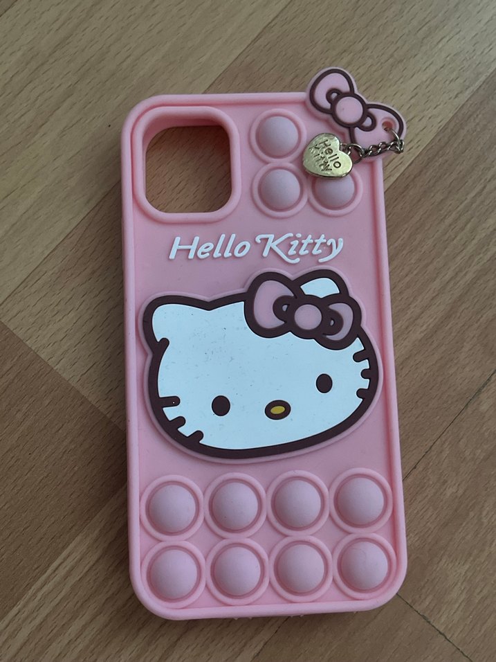Pastel pembe renkte, düğmeli tasarıma sahip Hello Kitty temalı telefon kılıfı. Küçük bir aksesuar ile pop kültür tarzını yansıtıyor.