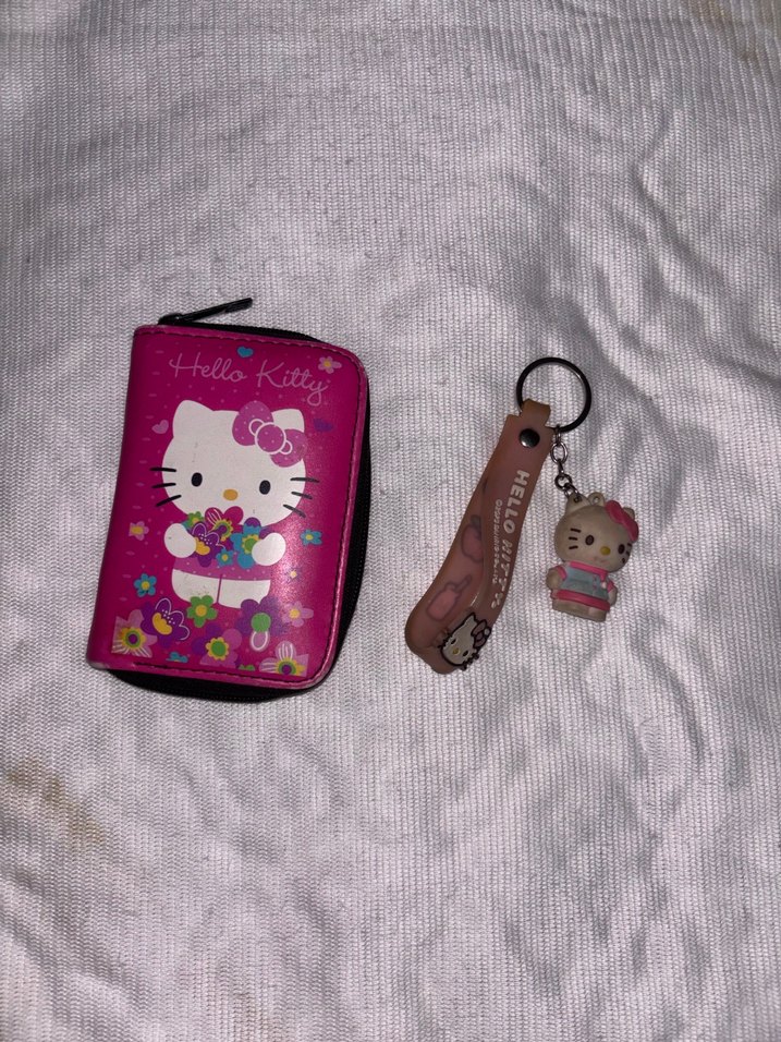 Pembe Hello Kitty cüzdan, fermuarlı ve baskılıdır. Aynı temada anahtarlıklar ile tamamlanmıştır.