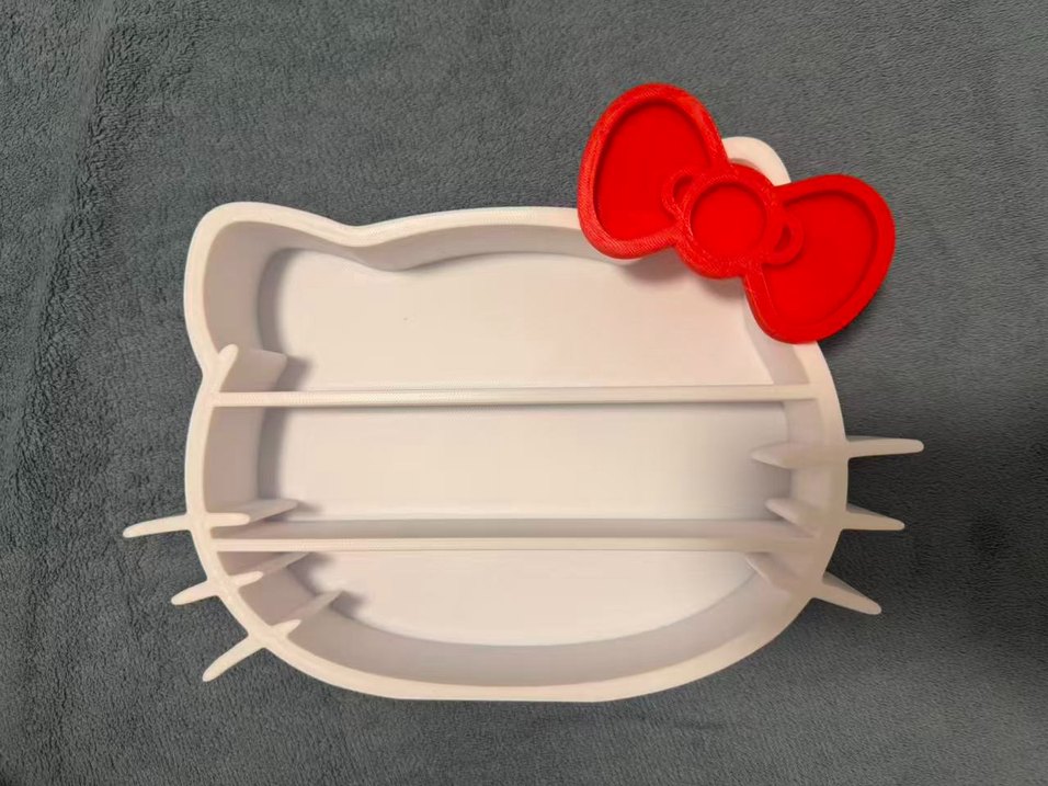 , Hello Kitty şeklinde, iki bölmeli ve kırmızı fiyonk detaylı çocuk rafı.