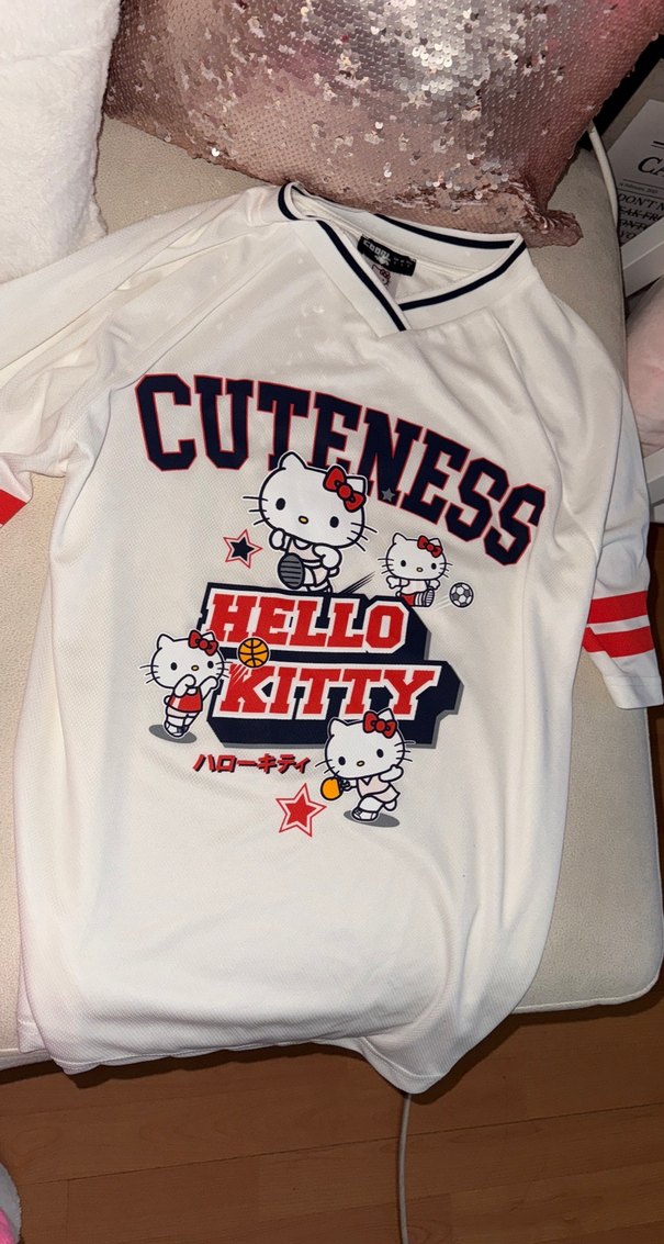 Pamuklu beyaz, kısa kollu ve bol kesim tişört. Kırlangıç yaka, kırmızı çizgili kol detayları ve Hello Kitty baskısı ile dikkat çeker.