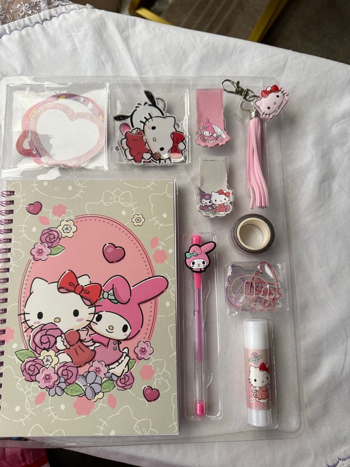 Yurt dışından alınmıştır. Parlak baskılı Hello Kitty figürlü pastel pembe kırtasiye seti; defter, kalem, çıkartma, ataş, bant ve dudak balmından oluşur. Bohem, retro tarzda. ✨ Hello Kitty & Friends DIY Journal Set – Primark Orijinal ve sıfır üründür, ambalajı açılmamıştır. Set içeriğinde Hello Kitty temalı spiralli bir defter, simli bant, klipsler, püsküllü anahtarlık, ayraçlar, kalem, yapıştırıcı ve çeşitli çıkartmalar içerir. Günlük, ajanda süsleme ve kırtasiye koleksiyonu için uygundur.