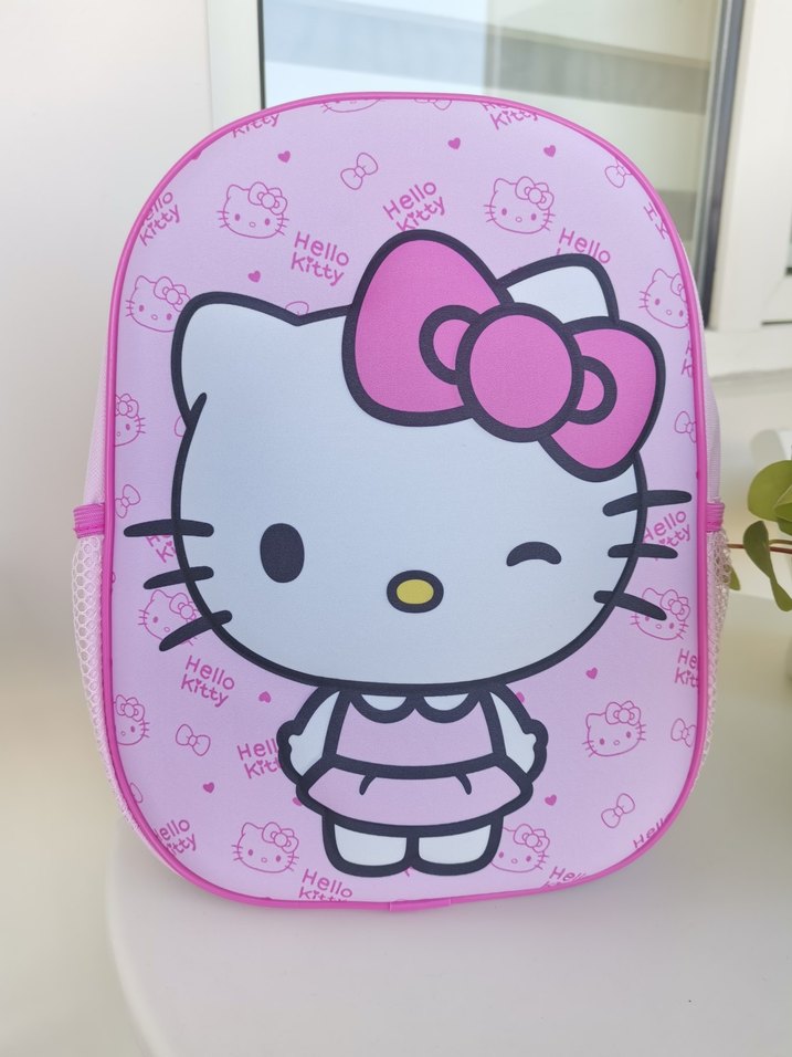 Renkli pembe çocuk okul çantası, büyük Hello Kitty figürü ve sevimli göz kırpması ile dikkat çekiyor. Yumuşak yüzeyli ve kompakt boyutta.