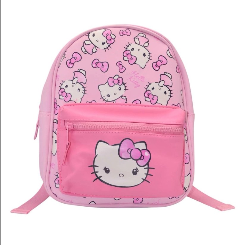 Pastel pembe renkte Hello Kitty desenli çocuk sırt çantası, önünde fermuarlı cep ve ayarlanabilir askılar bulunur.