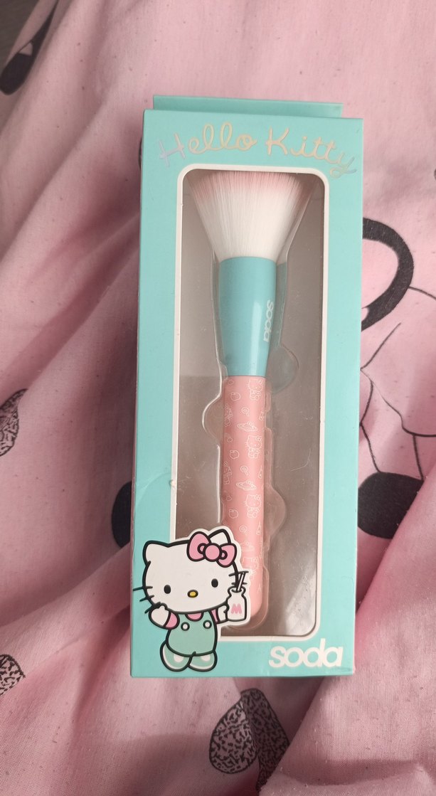 Hello Kitty temalı pastel renklerde, pembe saplı ve yumuşak beyaz kıllı makyaj fırçası. Soda markalı, mavi kutuda.