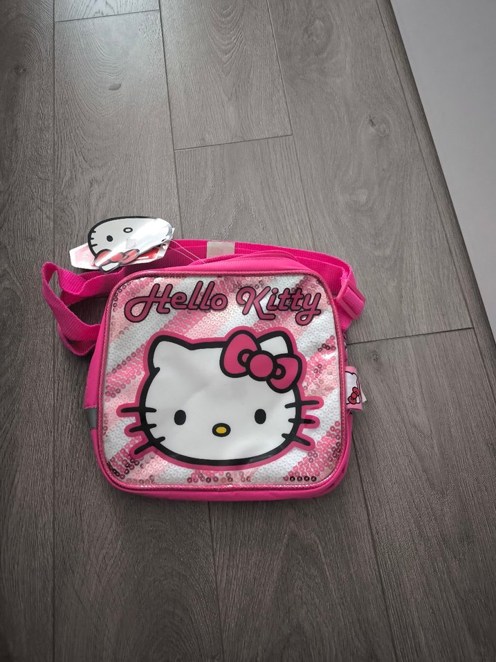 Sıfır Pastel pembe renkte, önü payetli Hello Kitty desenli ve ayarlanabilir askılı çocuk okul çantası.